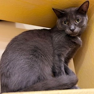 Lily is a stunning short haired grey cat with gorgeous amber eyes, a little white spot on her chest with a look that says “love me please”.