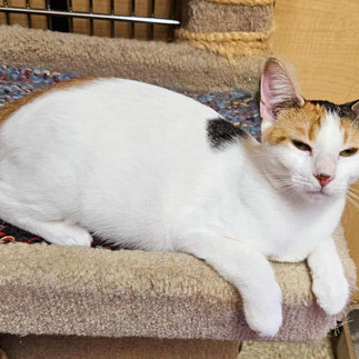 Now fully healed, Grumbles is flourishing and embracing every moment of her indoor kittenhood while she patiently waits for her furever family. She is a gorgeous short-haired calico, mostly white with delicate patches of calico colour, and her intense amber eyes are windows to her affectionate soul.